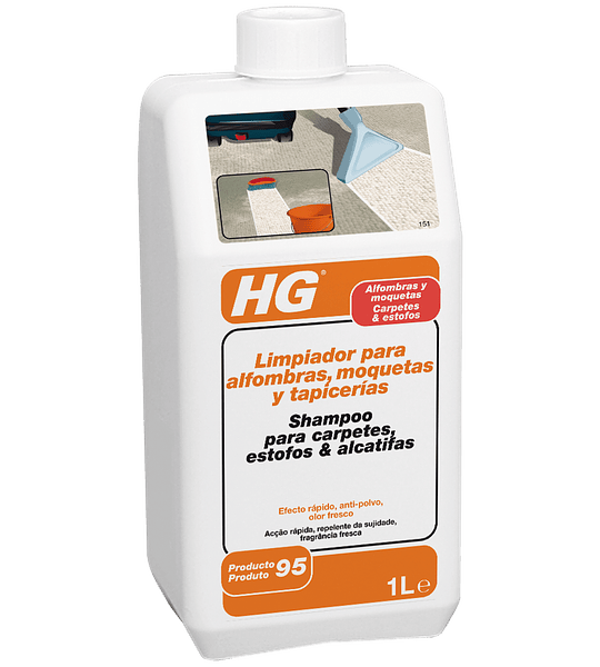 HG Limpiador para alfombras, moquetas y tapicerías (HG producto 95) lo repone con un material repelente a la suciedad. Tratar las manchas de antemano con HG Quitamanchas profesional para alfombras, moquetas y tapicerías. después aplicar HG Limpiador para alfombras, moquetas y tapicerías (HG producto 95) con una máquina especial y acto seguido extraer por aspiración o frotar con un cepillo. Después secar con una toalla de rizo. Un litro es suficiente para una superficie de 30 metros cuadrados.